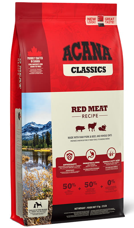 ACANA Classics Red Meat zawiera pełnowartościowe białko zwierzęce pochodzące z aromatycznych, lubianych przez psy, czerwonych mięs: wołowinę, jagnięcinę i wieprzowinę.