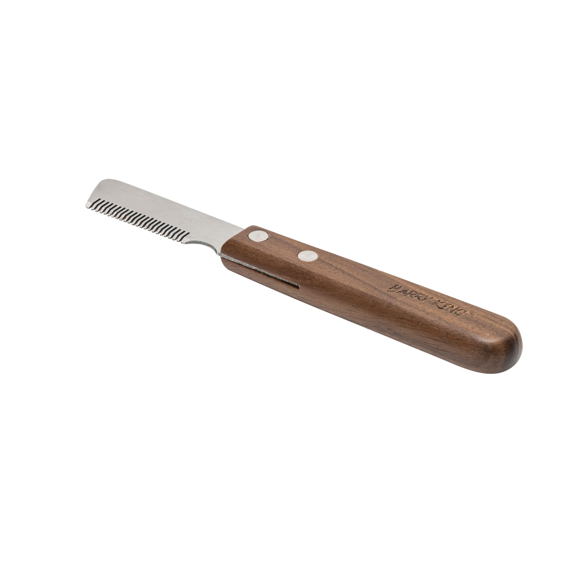 - Każde narzędzie Barry King wyróżnia się także dbałością o detale, co widać w eleganckim grawerze logo marki na rączce, podkreślającym jakość i styl produktu.