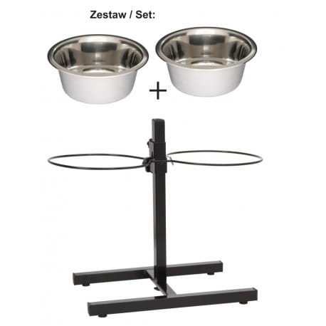 Wysokiej jakości zestaw dwóch misek ze stali nierdzewnej na stojaku o regulowanej wysokości i pojemności 2,8 L. Idealne rozwiązanie dla psów – miski dzięki prawidłowemu ustawieniu do wysokości psa, wpływają pozytywnie na trawienie.