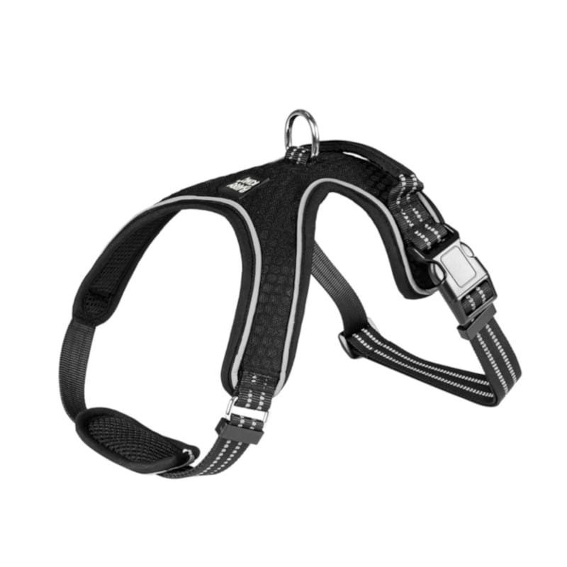 • Solidne zapięcie na dwie plastikowe klamry oraz metalowy zaczep do smyczy zapewniają pewność i stabilność podczas użytkowania. Dodatkowo, uchwyt na górze umożliwia łatwe chwycenie psa, co jest przydatne w sytuacjach wymagających szybkiej kontroli.