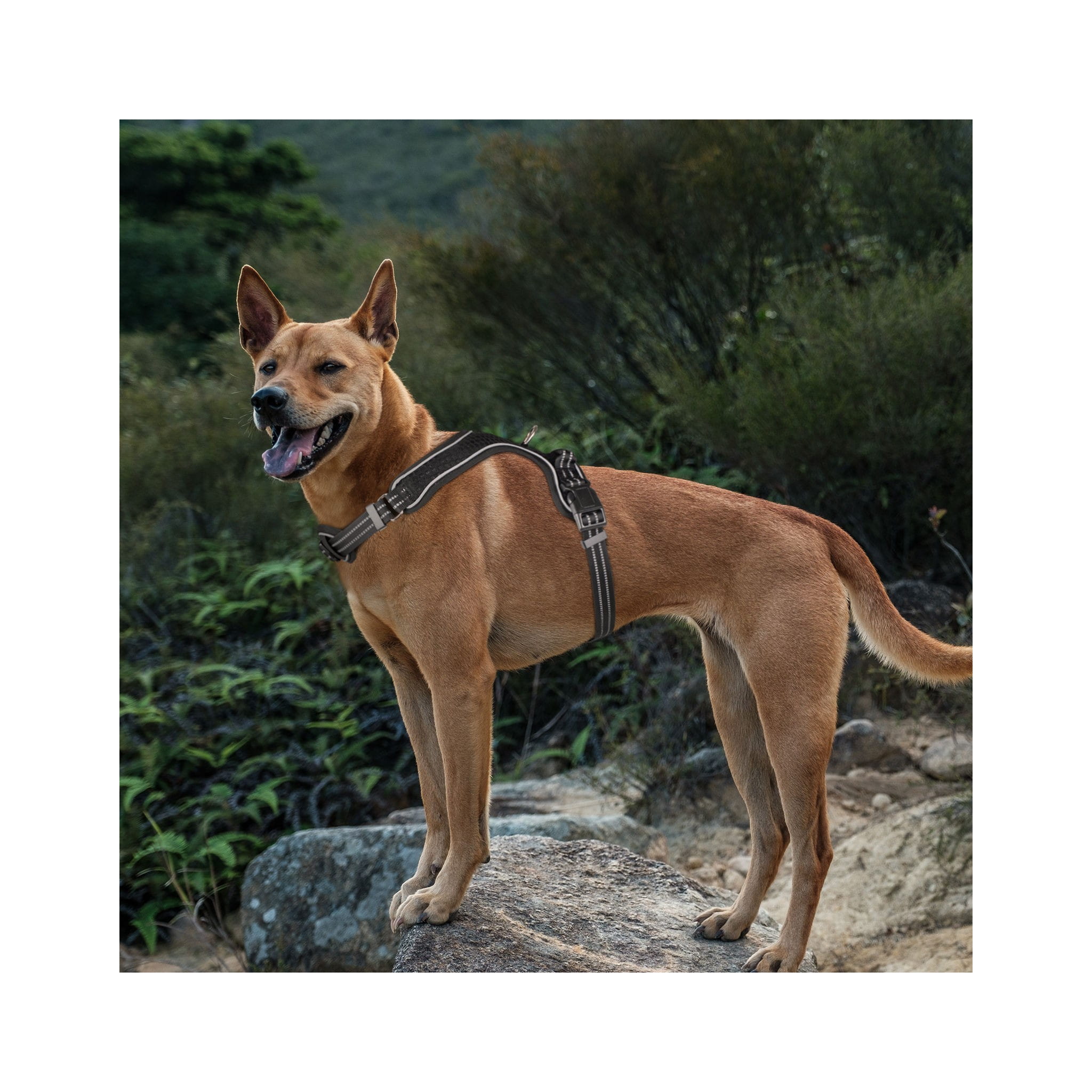 • Szelki posiadają regulowany obwód na wysokości szyi i klatki piersiowej, co pozwala na idealne dopasowanie do budowy ciała psa.