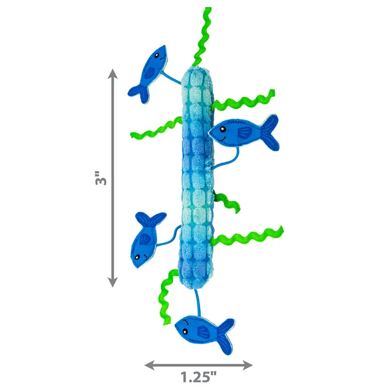 KONG Kickeroo Stickeroo to wielozmysłowe urozmaicenie w długim, miękkim kształcie, który zachęca do zdrowych zapasów całym ciałem i kopania tylnymi łapkami. Faliste wodorosty i przyciągająca wzrok ławica błyszczących rybek przywiązanych gumką zachęcają do dynamicznego odbijania i skakania podczas „podwodnych” przygód. Świetnie nadają się również do nagradzania instynktu chwytania. Trzaski i KONG Premium North American Catnip na całej długości patyczka zachęcają do naturalnej, satysfakcjonującej zabawy z każdym ruchem.