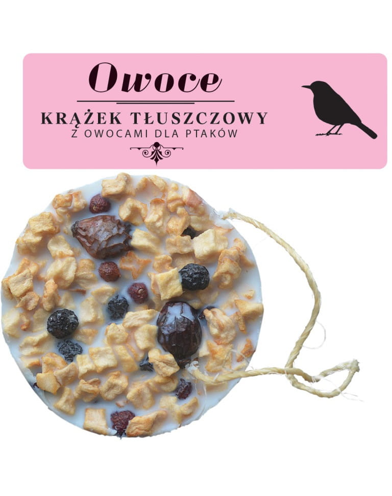 Ptaki mają wysokie zapotrzebowanie na energię, szczególnie jesienią i zimą. Dzikie ptaki to nasi sprzymierzeńcy w walce ze szkodnikami w przydomowych ogrodach. Dlatego tym bardziej warto zadbać o ich kondycję. Krążek tłuszczowy wraz z dodatkami to doskonałe źródło pożywienia, w okresie kiedy naturalny pokarm jest trudny do zdobycia. Krążki nie zawierają soli. Składają się z łoju zwierzęcego, który jest świetnym zamiennikiem tłuszczu zwierzęcego dla ptaków owadożernych. Owoce to zaś źródło cennych makro i mikro elementów.