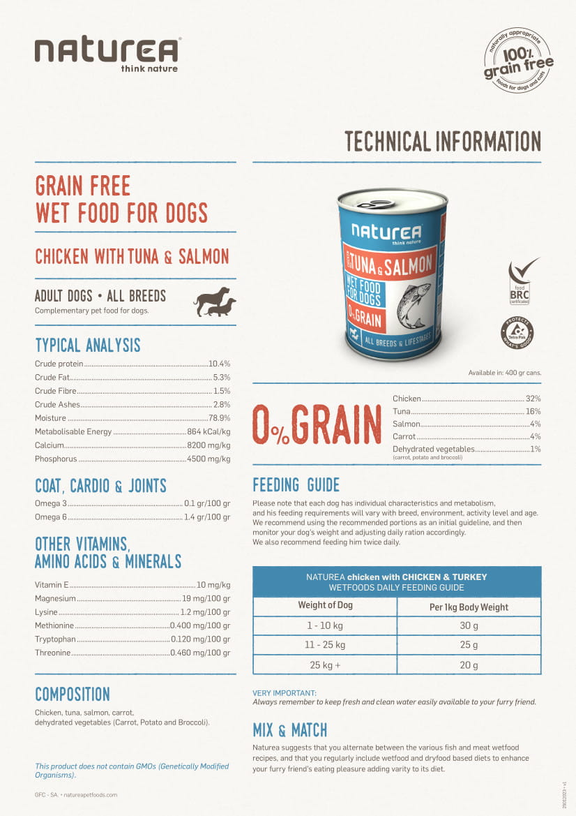 Bezzbożowa mokra karma Naturea to formuła opracowana przez lekarzy weterynarii i zwierzęcych dietetyków, która całkowicie zaspokaja codzienne potrzeby żywieniowe szczeniąt i dorosłych psów wszystkich ras i wielkości. Dieta ta posiada co najmniej 88% świeżego mięsa lub ryb, czyli białek podobnych do tych, które nasi czworonożni przyjaciele znaleźliby w naturze. Ten wyjątkowo smaczny posiłek zawiera łatwo przyswajalne składniki, wszystkie niezbędne aminokwasy, wysokiej jakości tłuszcze i oleje oraz zrównoważone kwasy tłuszczowe Omega 3 i Omega 6, których Twój pies codziennie potrzebuje.