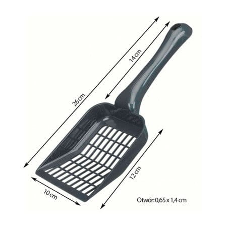 Łopatka wykonana z wysokiej jakości tworzywa idealnie sprawdzi się do utrzymania czystości w kociej kuwecie. Posiada wyższy brzeg zabezpieczający przed wysypywaniem się żwirku podczas sprzątania. Łopatka posiada podłużne otwory umożliwiające oddzielenie niezużytego żwirku od ekskrementów. Idealnie sprawdzi się przy drobnych żwirkach, np. bentonitowych lub silikonowych.