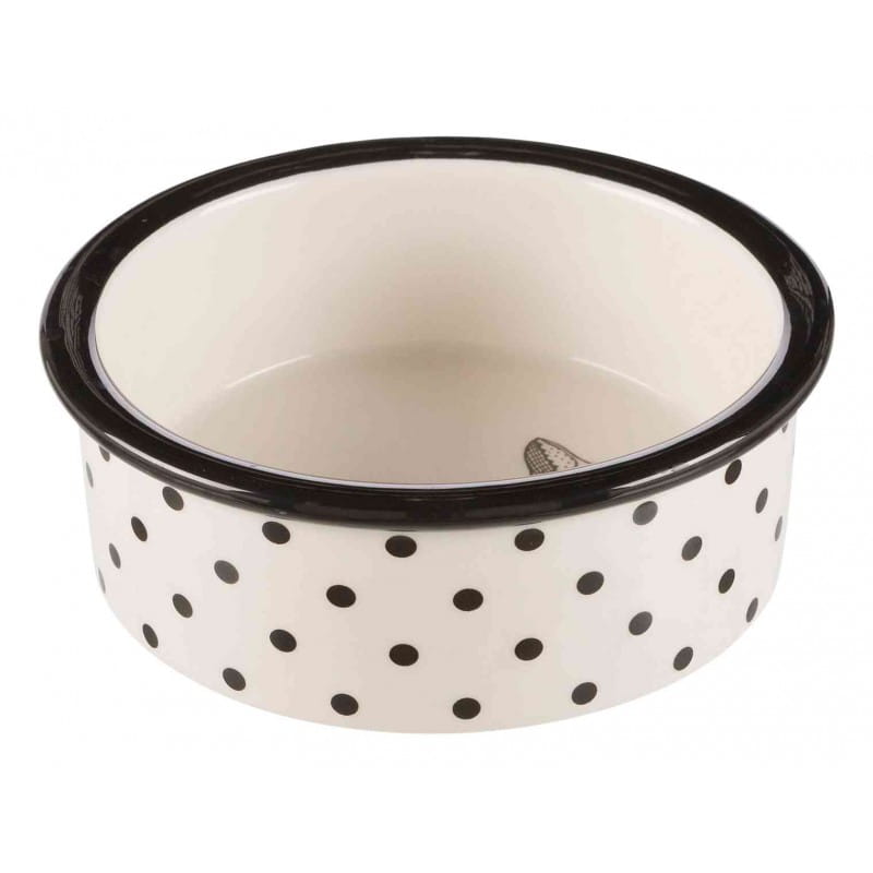 Okrągła miska przeznaczona dla kotka. Idealnie sprawdzi się do podawania karmy czy wody. Ciężar miski utrudnia jej przesuwanie się po podłodze oraz ewentualne wywrócenie. Ceramiczna miska o modnym designie w kolorze białym kolorze z czarnymi kropkami i kotem na dnie. Jest łatwa do utrzymania w czystości.