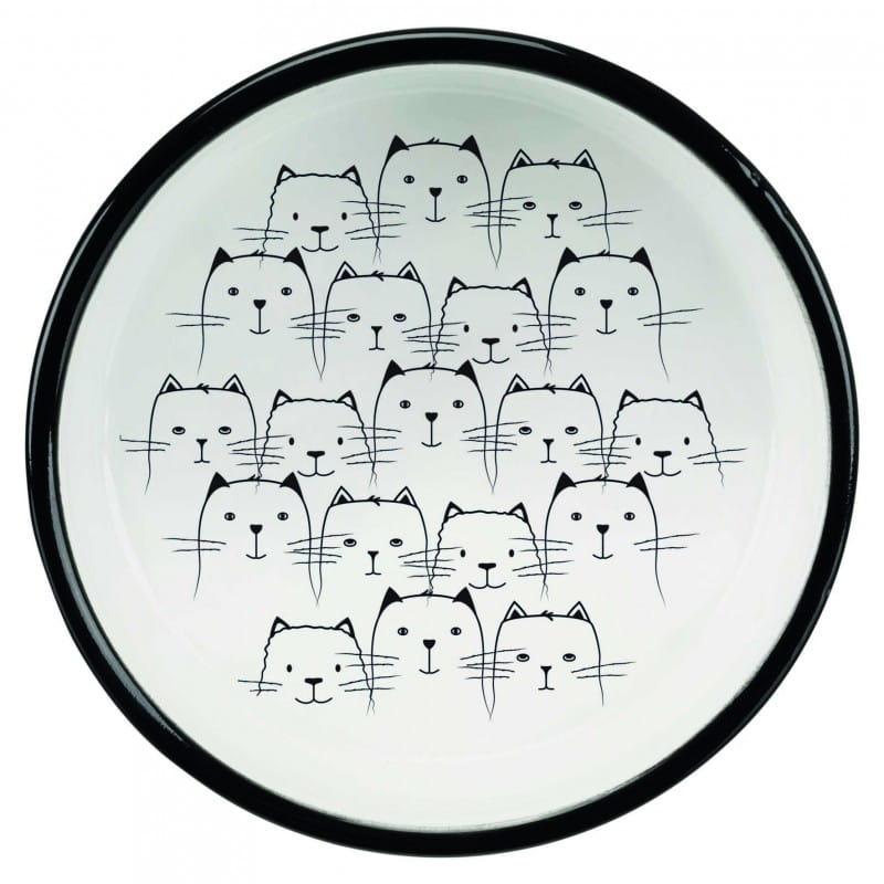 Okrągła miska przeznaczona dla kotów. Idealnie sprawdzi się do podawania karmy czy wody. Ciężar miski utrudnia jej przesuwanie się po podłodze oraz ewentualne wywrócenie. Ceramiczna miska o modnym designie w kolorze czarno - białym z kotami na dnie. Jest łatwa do utrzymania w czystości. Produkt jest dosyć płytki, dzięki czemu mogą z niego również korzystać koty płaskonose.