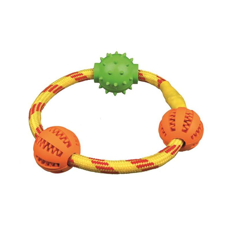 Trixie sznur Denta Fun to połączenie mocnego sznura/ ringu z trzema piłkami. To zdecydowanie ciekawa propozycja zabawki dla psów. Dzięki lateksowym piłkom o średnicy 5 cm, dodatkowo wspomagane jest utrzymanie higieny jamy ustnej psa.