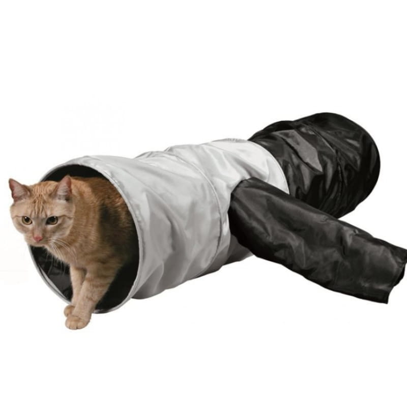 Nylonowy tunel dla kota posiada 2 wejścia główne oraz wyjścia po dwóch bokach. Doskonały do zabawy w domu i w ogrodzie. Zaspokaja kocią potrzebę skradania się i chowania w kryjówkach. Wewnątrz znajduje się szeleszczący materiał, który pobudza koci instynkt do zabawy. Przód, tył i środek tunelu jest usztywniony przez co koty mogą swobodnie się do niego dostać.