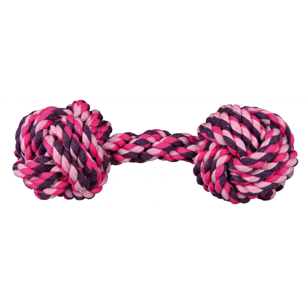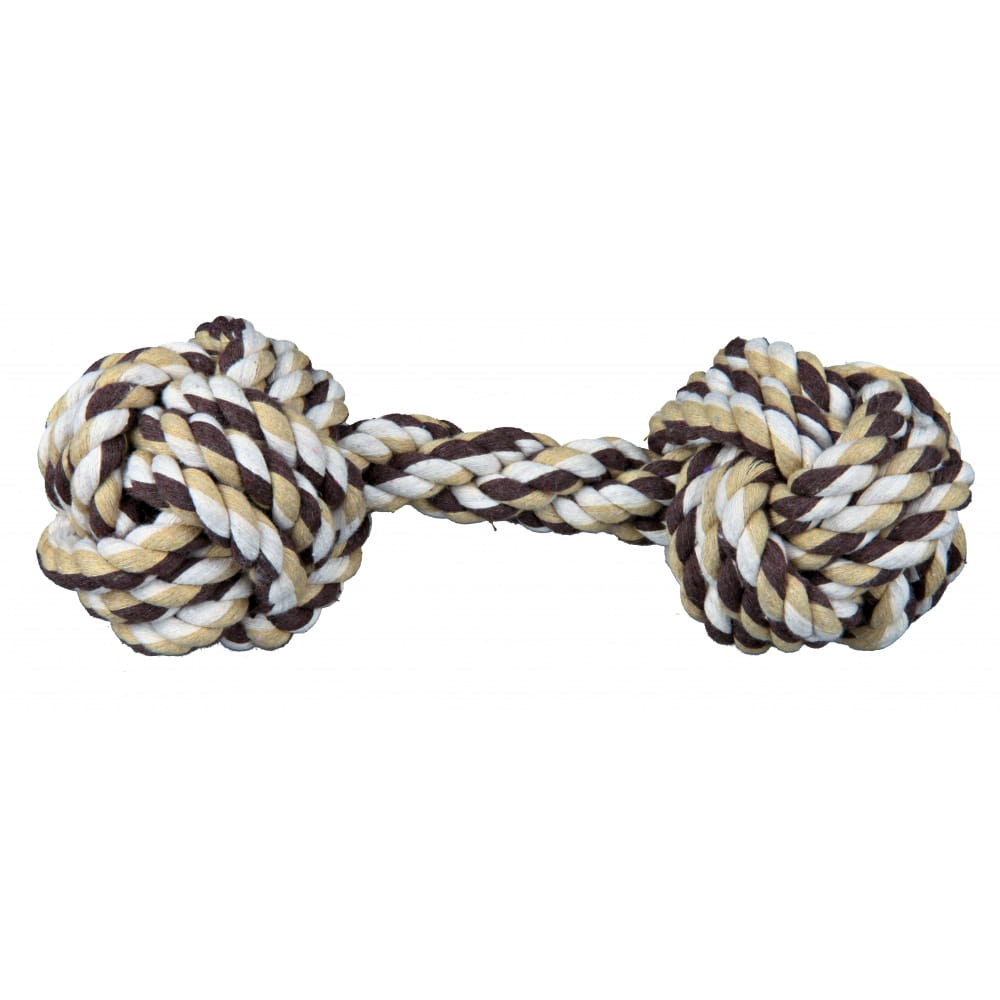 Hantelek Trixie wykonany został z wysokiej jakości bawełny. Bardzo mocno zapleciony. Na każdym końcu znajduje się sznurowa piłeczka. Zapewnia godziny wspaniałej zabawy dla psa, wspomagając przy tym prawidłową higienę jamy istnej. Zabawka idealna do: gryzienia i aportowania